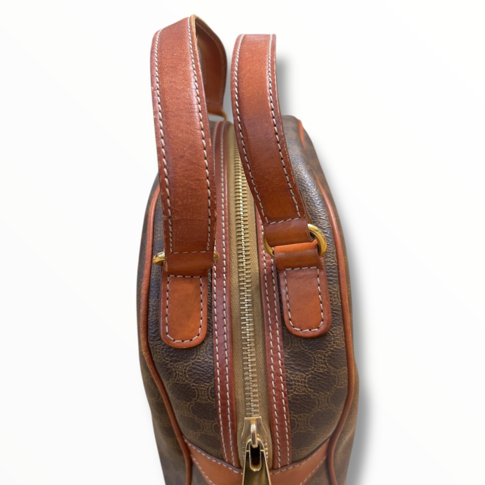 Outside: The leather shows signs of wear with some rubs, minor discolouration, and cracks. The canvas remains in great condition. The handles have some minor cracks and discolouration.