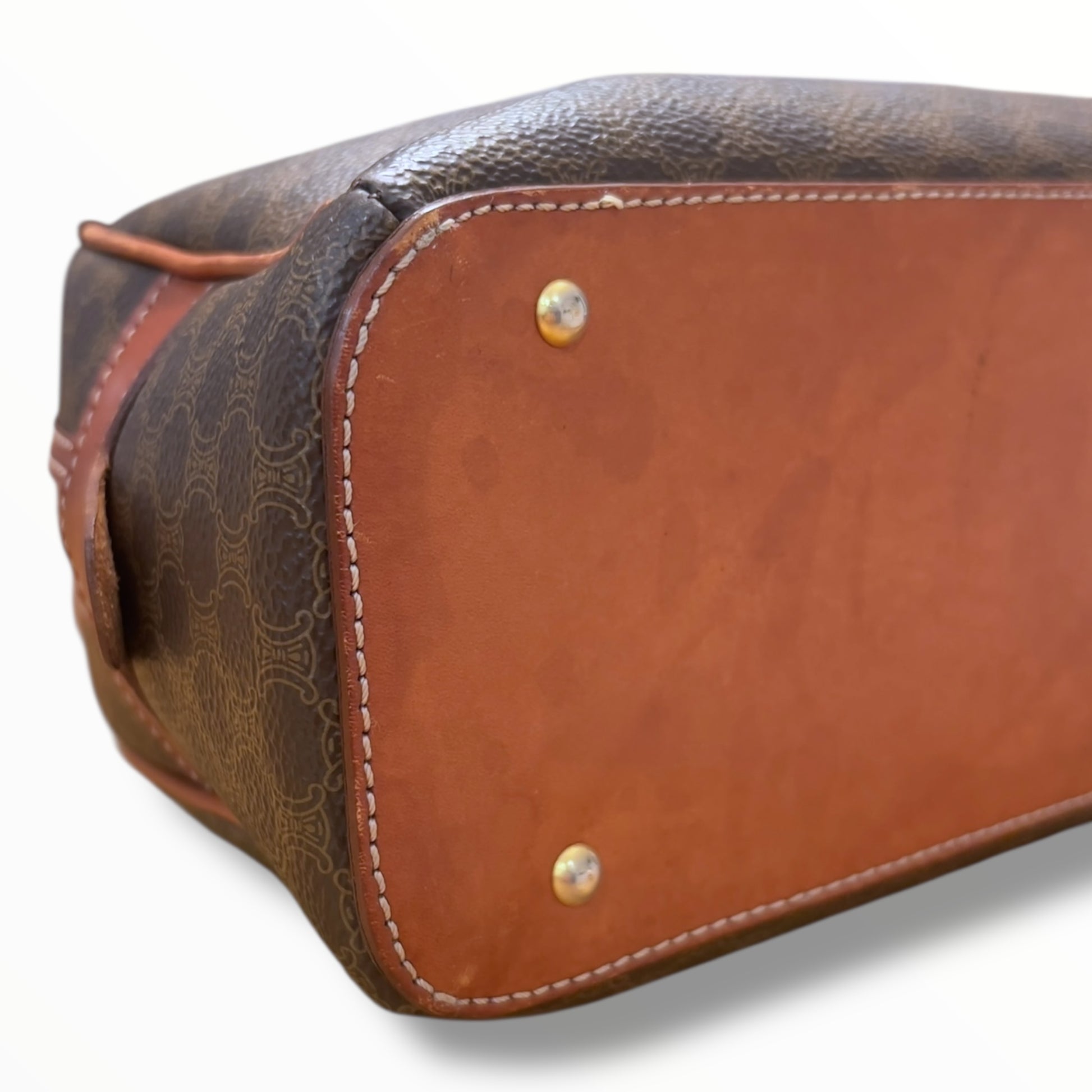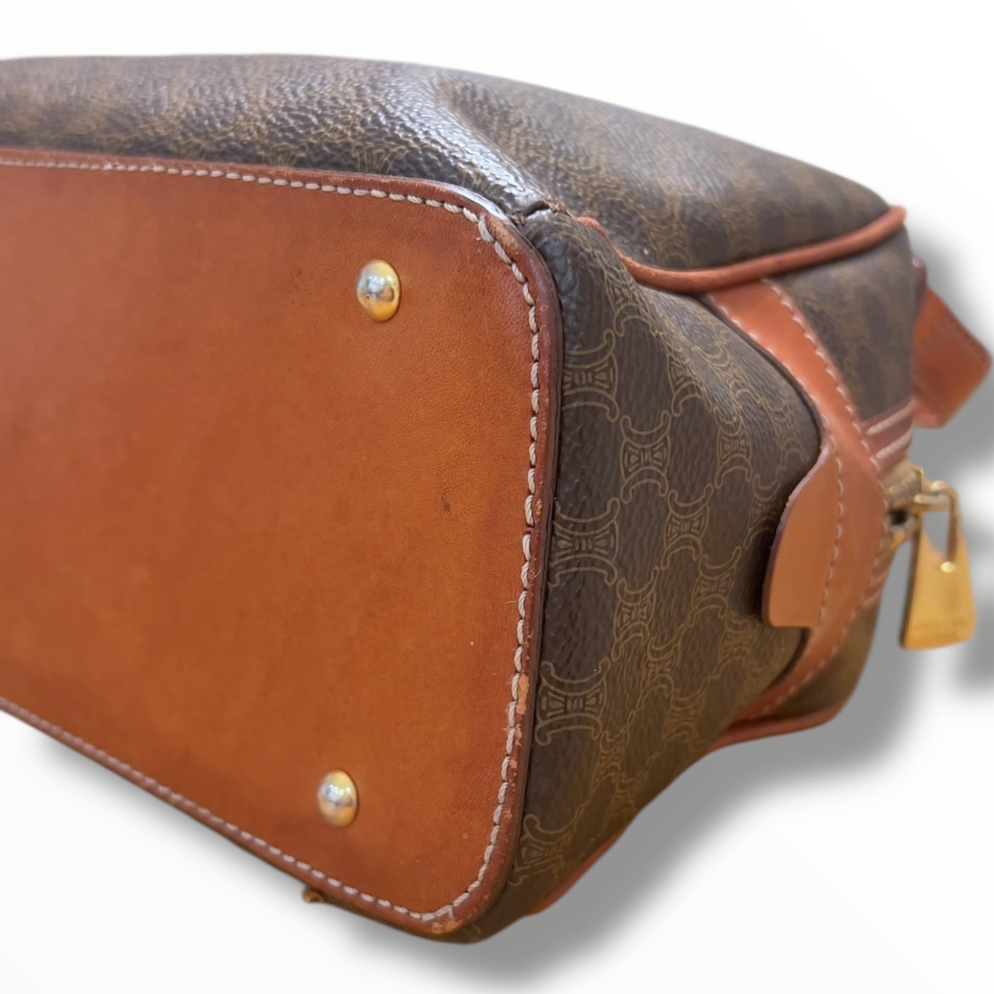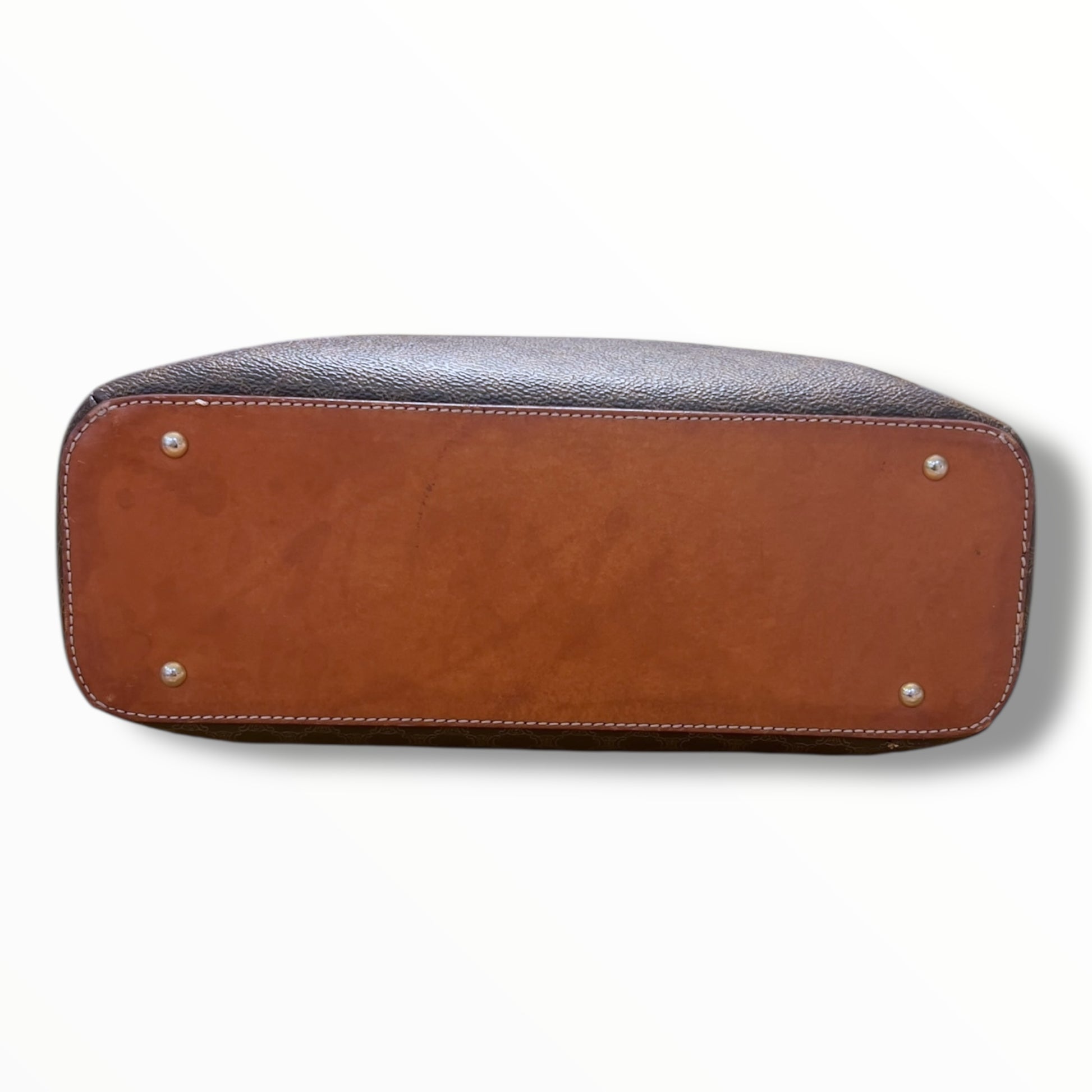 Bottom: The bag has protective metal feet with scratches. The leather base and corners have minor rubs and stains.