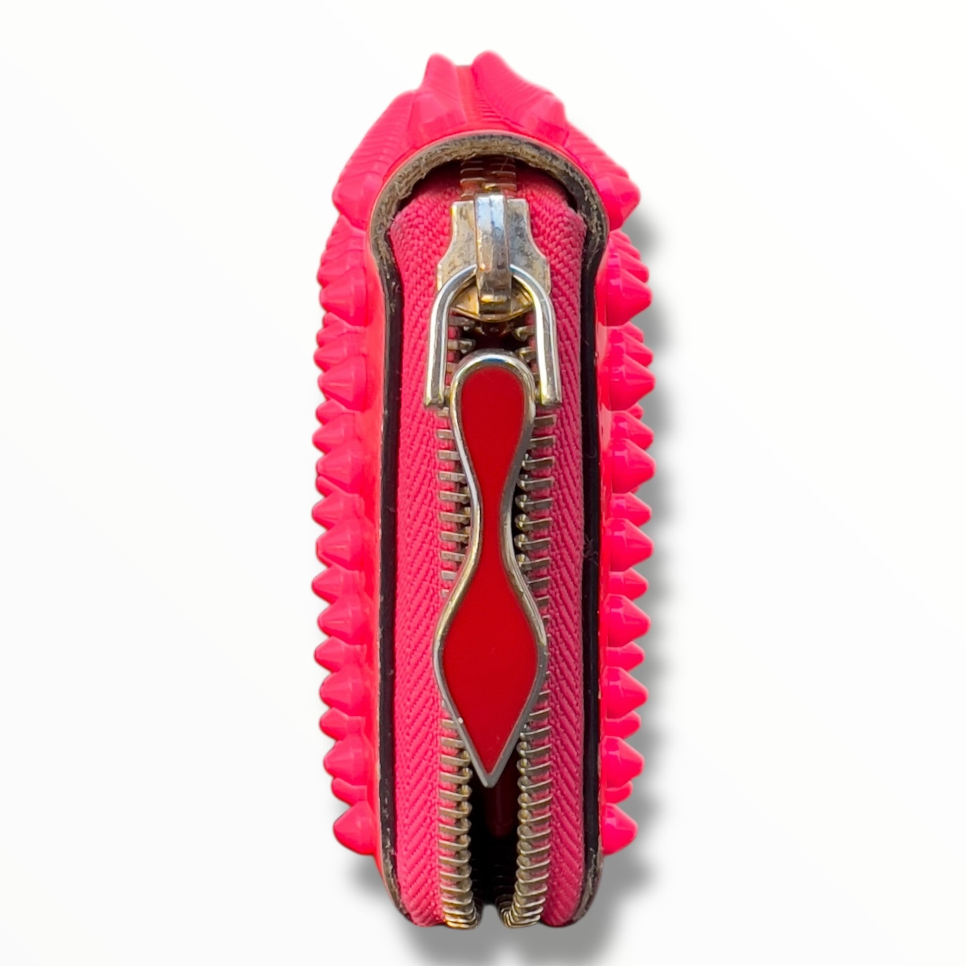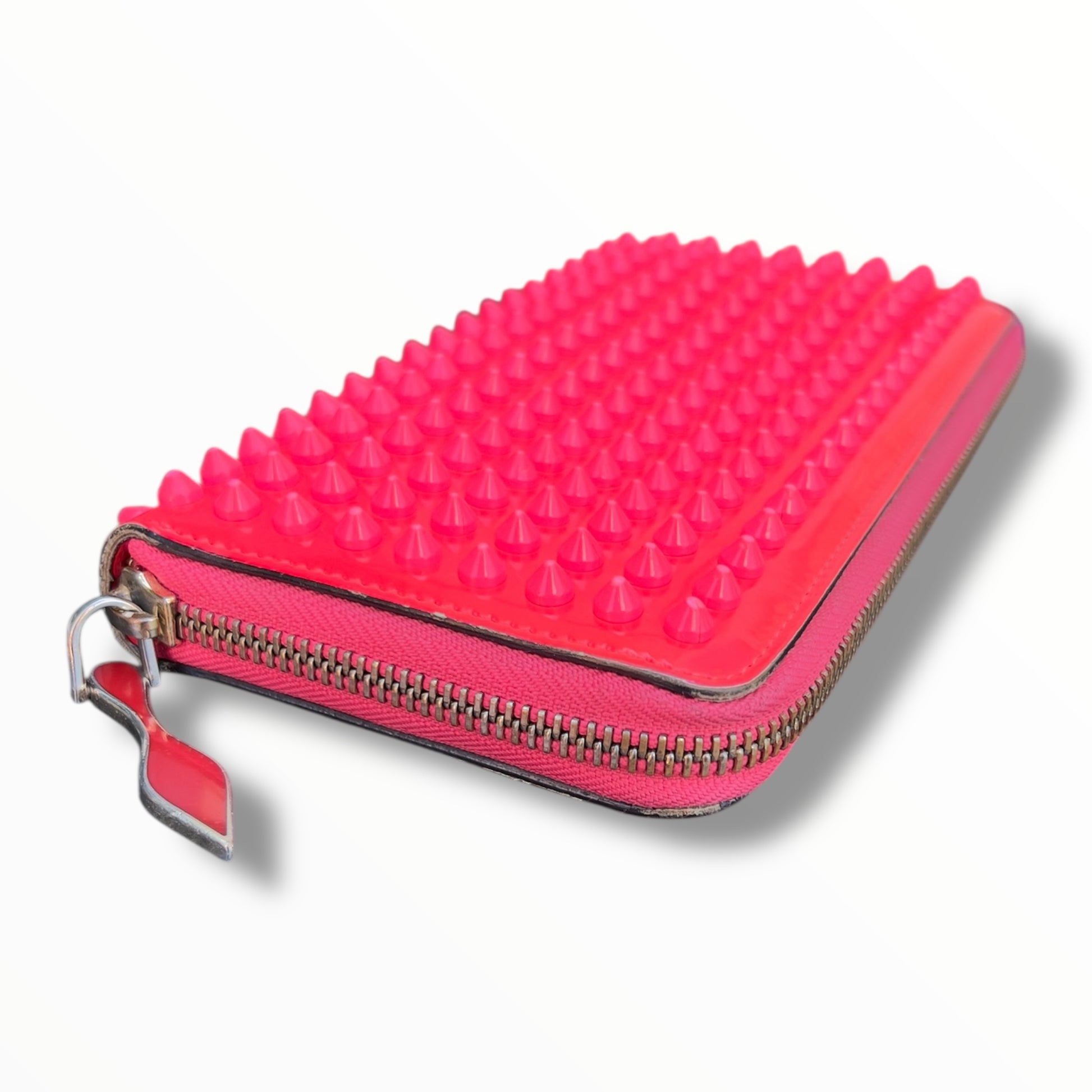This long wallet, made in France from glossy neon pink enamel leather, highlights the brand's signature style, featuring Christian Louboutin's iconic spikes on the outside, classic zip-around design, and iconic red interior, which reflects the essence of Louboutin's luxury and sophistication.