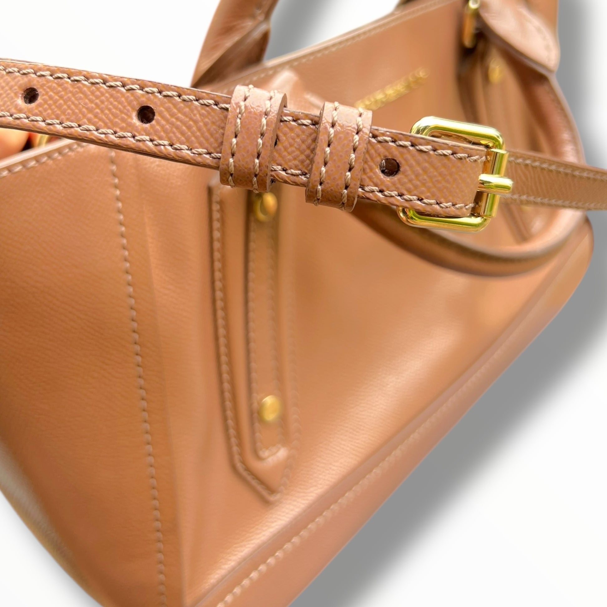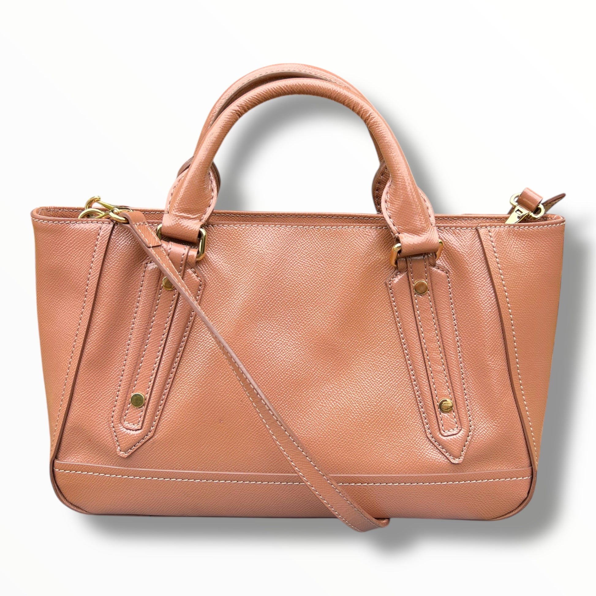 Made from glossy pink enamel leather, it features shiny gold hardware, dual top handles for easy carrying, and a detachable shoulder strap for added convenience. The soft fabric-lined interior offers plenty of space for your essentials, keeping everything within quick reach.