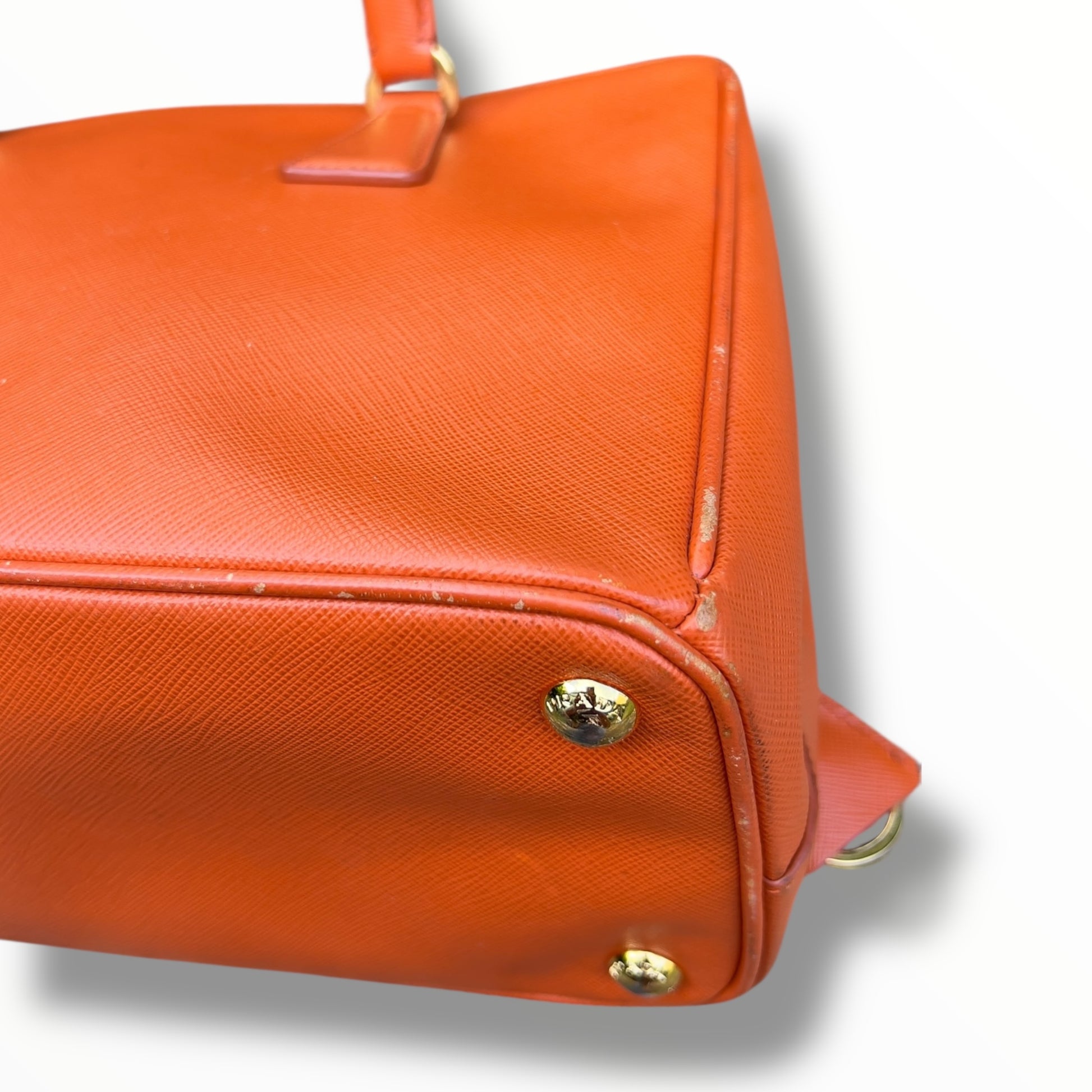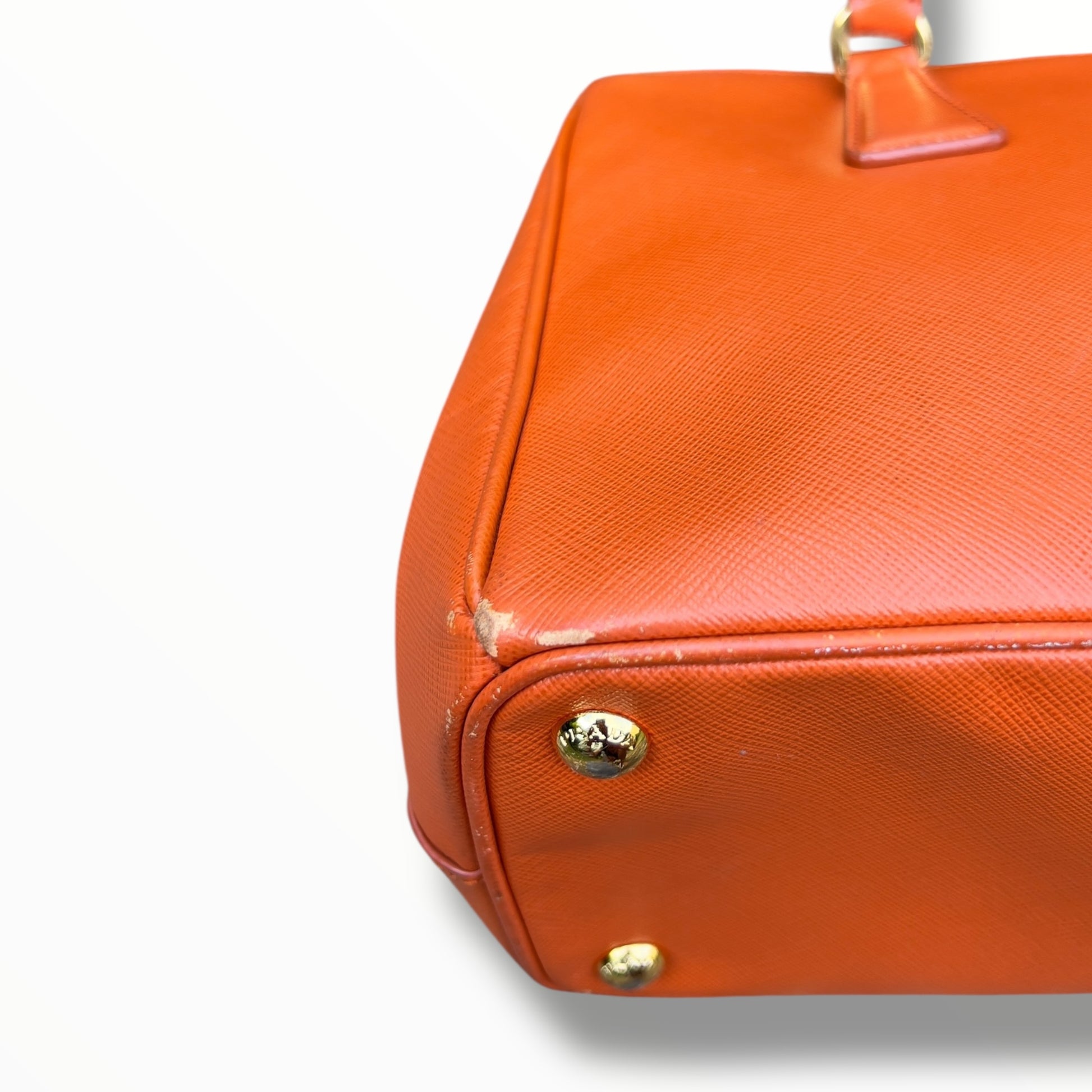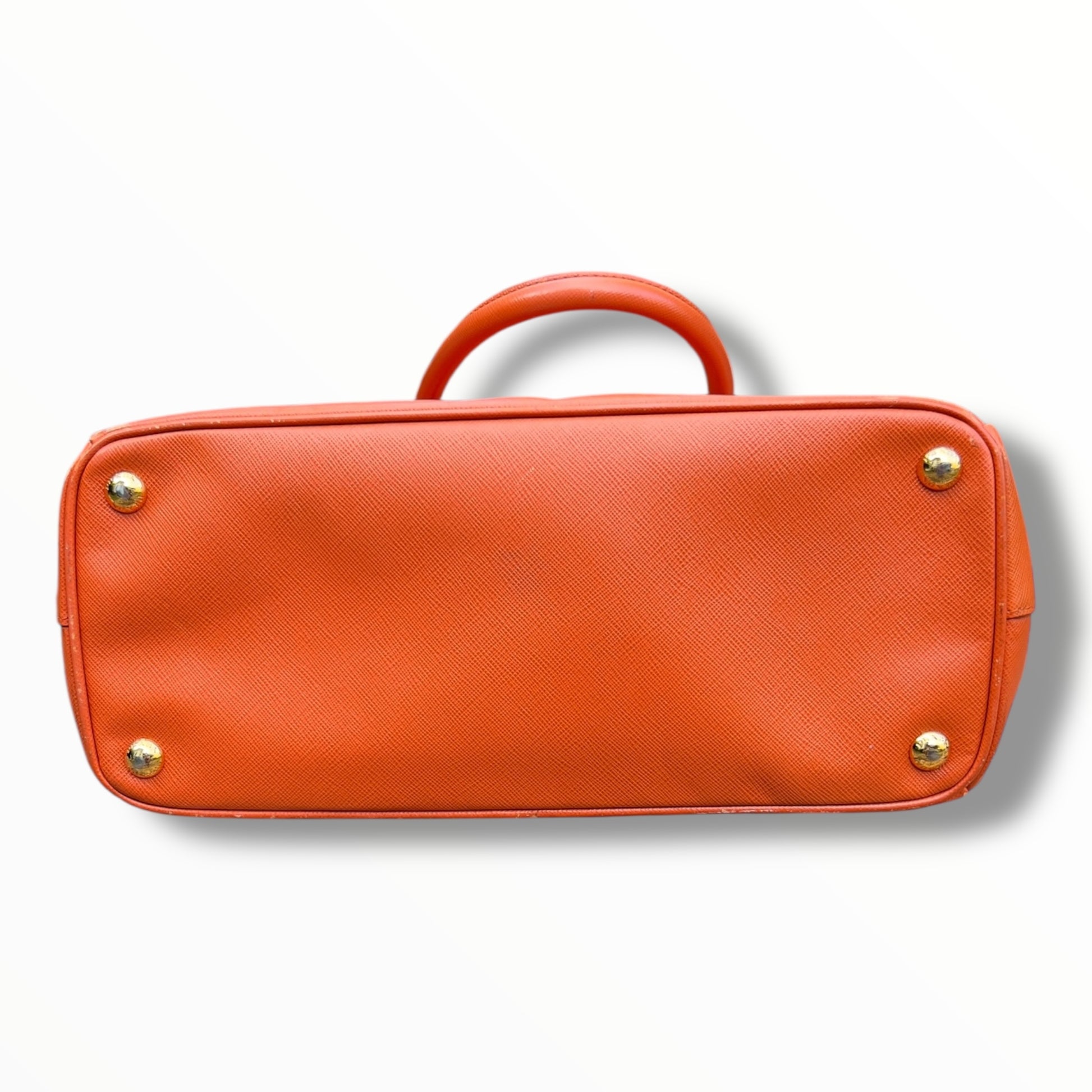 This striking orange Prada Galleria bag, made in Italy and first released around 2007, is crafted from the brand’s signature Saffiano calfskin leather. Known for its durability and distinctive crosshatch texture, the leather is scratch- and water-resistant, combining practicality with luxury.