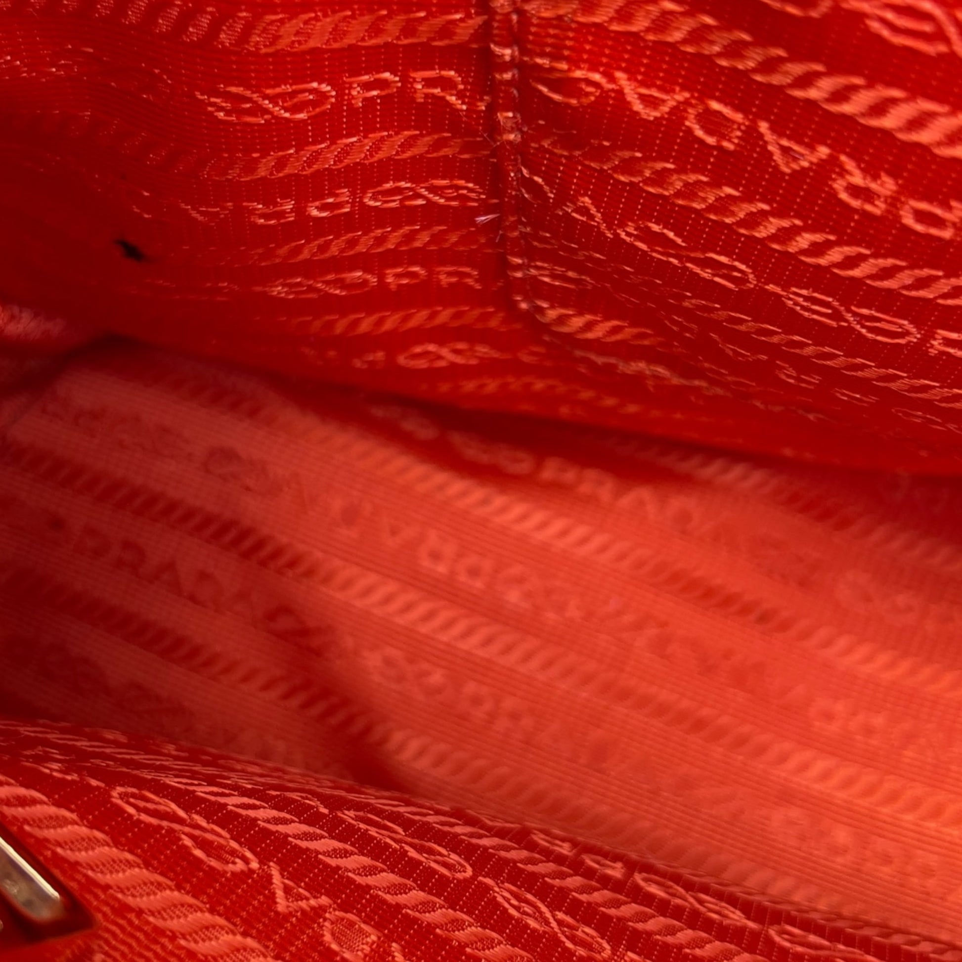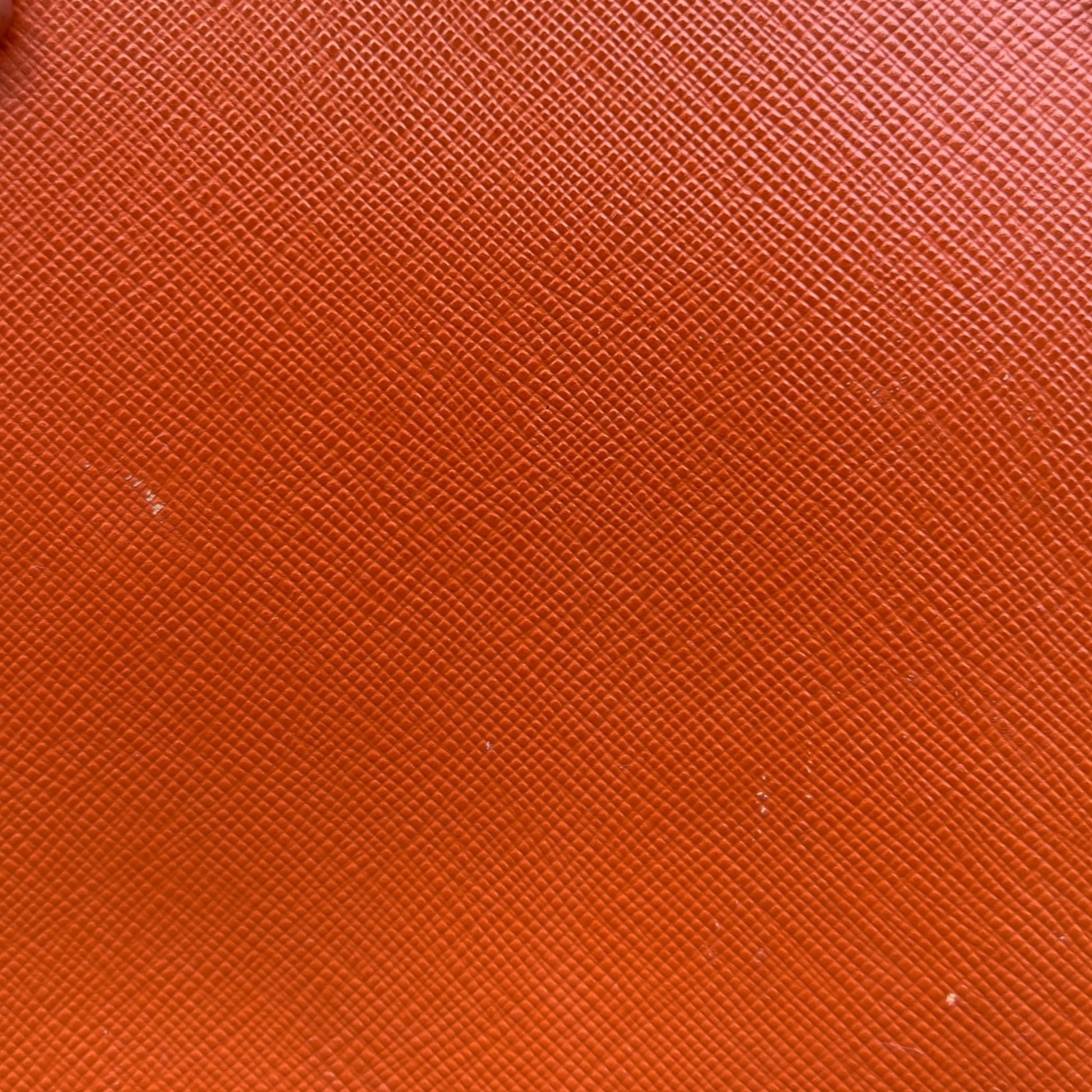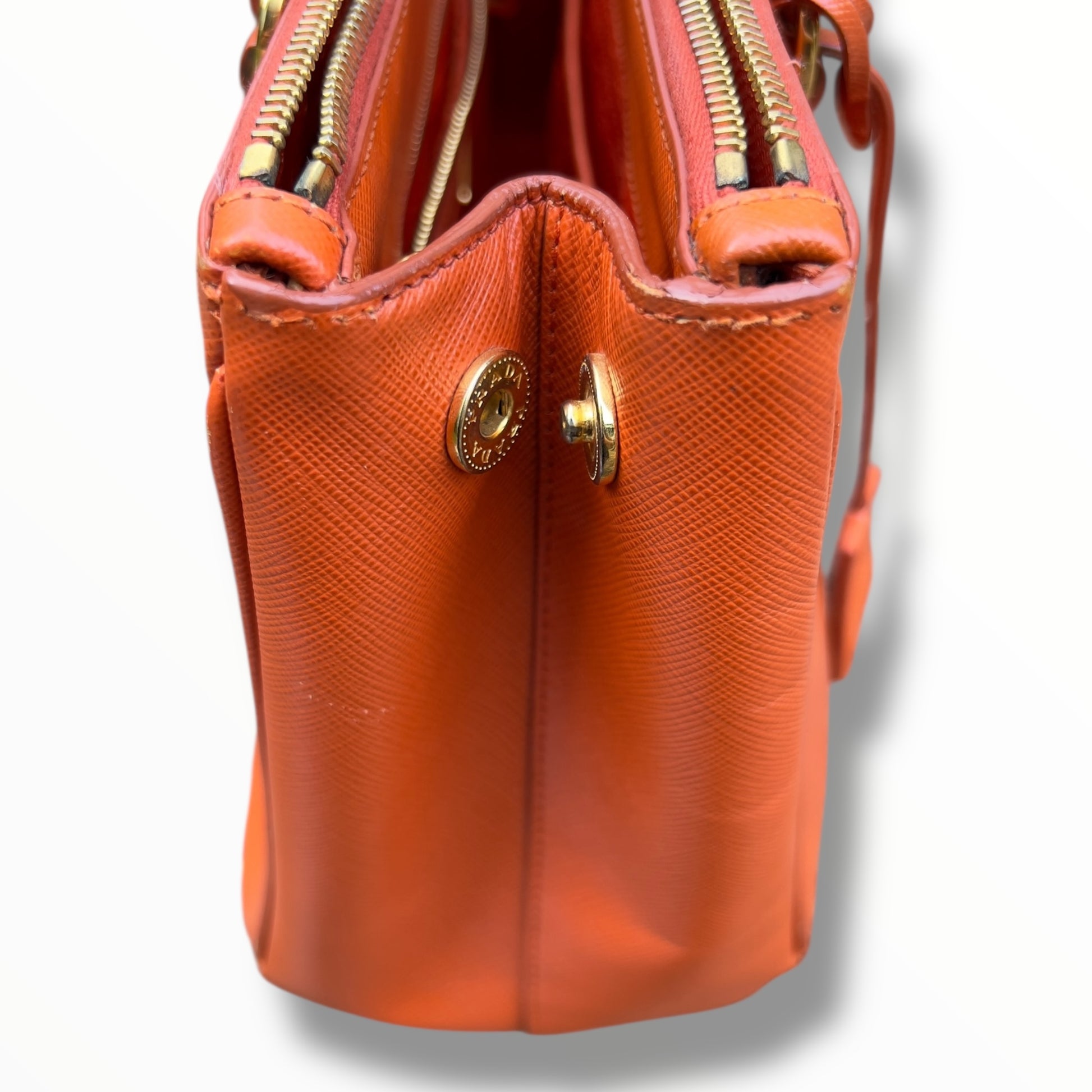 This striking orange Prada Galleria bag, made in Italy and first released around 2007, is crafted from the brand’s signature Saffiano calfskin leather. Known for its durability and distinctive crosshatch texture, the leather is scratch- and water-resistant, combining practicality with luxury.
